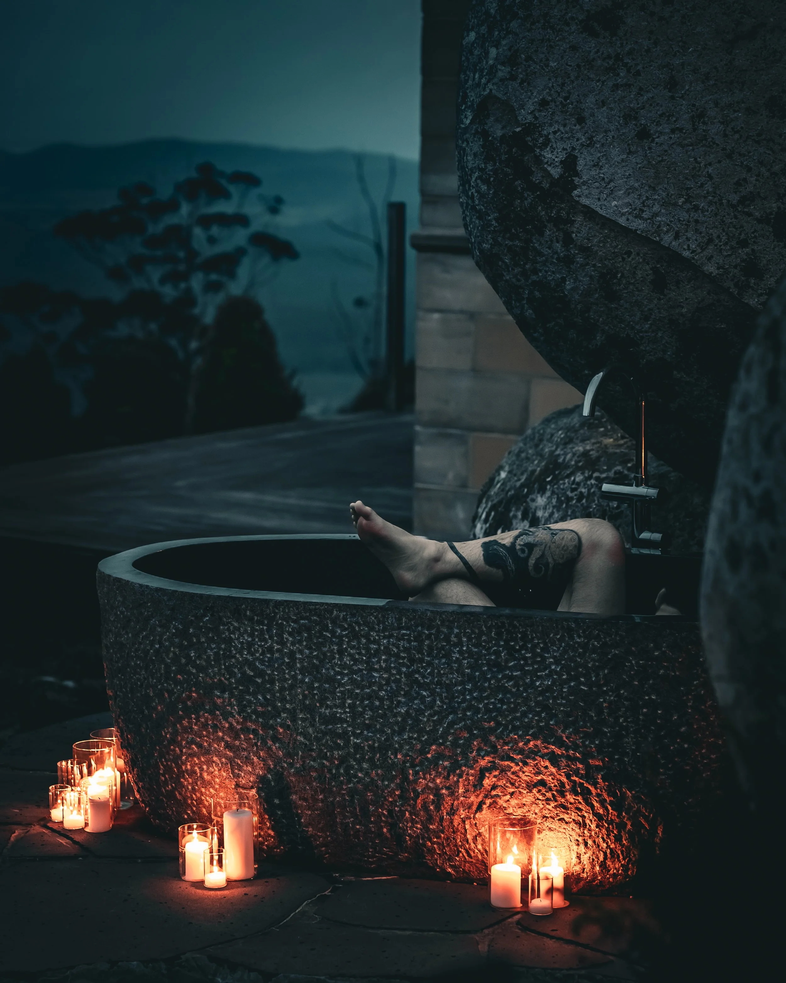 While some plunge into icy waters elsewhere, you and your partner slip into a steaming granite bath perched high on the Blue Tier. A curated bath table, a bottle of bubbles within easy reach, and the rare luxury of knowing no one else is anywhere nearby.